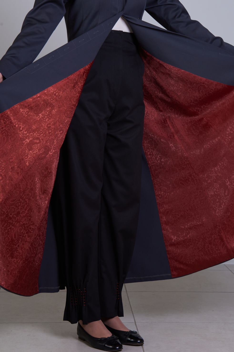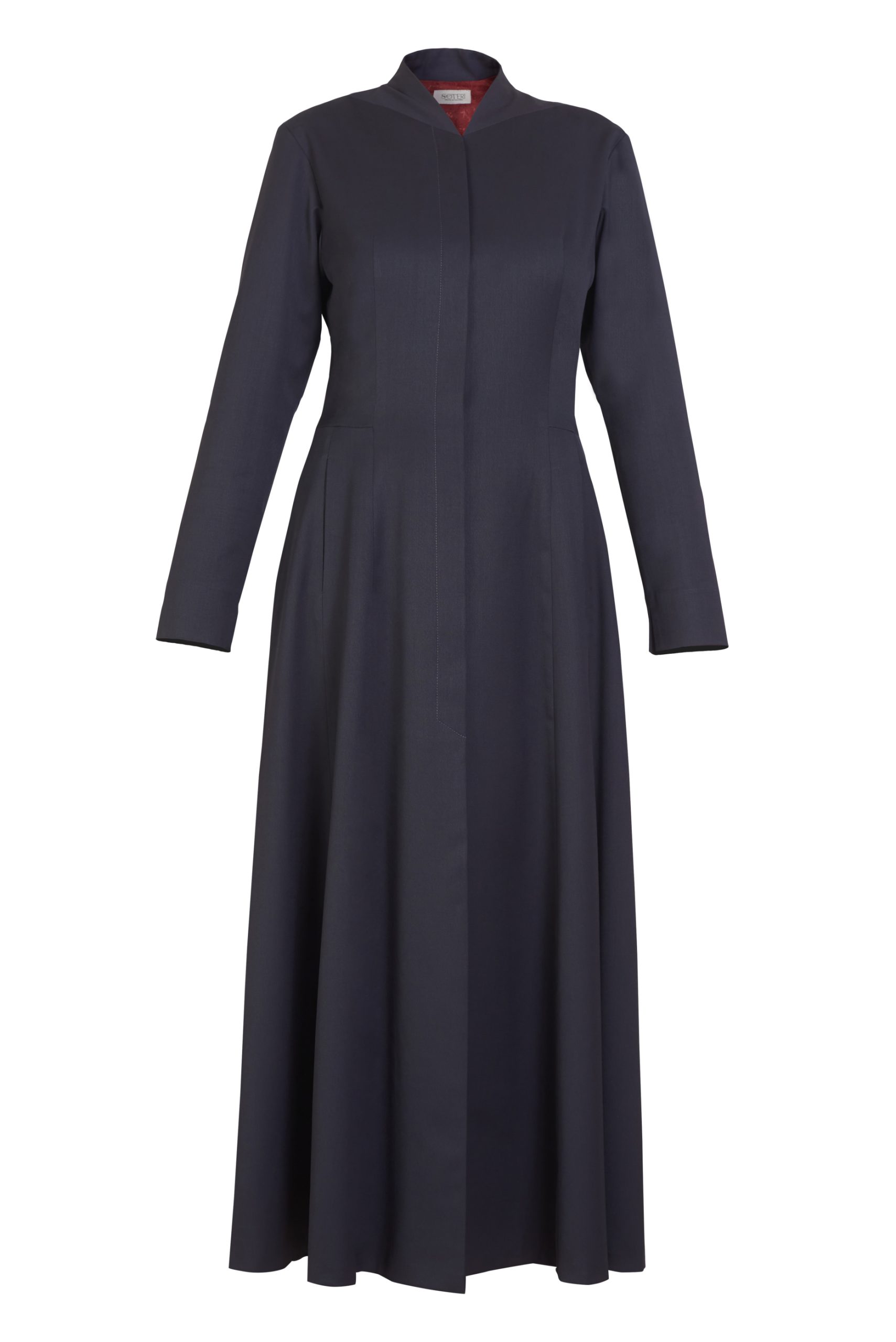 Define your autumn and winter wardrobe with this sophisticated long dress, crafted from 100% Super 120s wool in premium gray for exceptional warmth and drape. A vibrant red interlining adds a secret pop of color while bold red thread highlights intricate folds on the back, creating a striking contrast that enhances the garment’s movement.