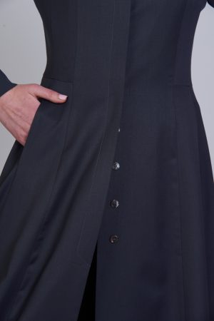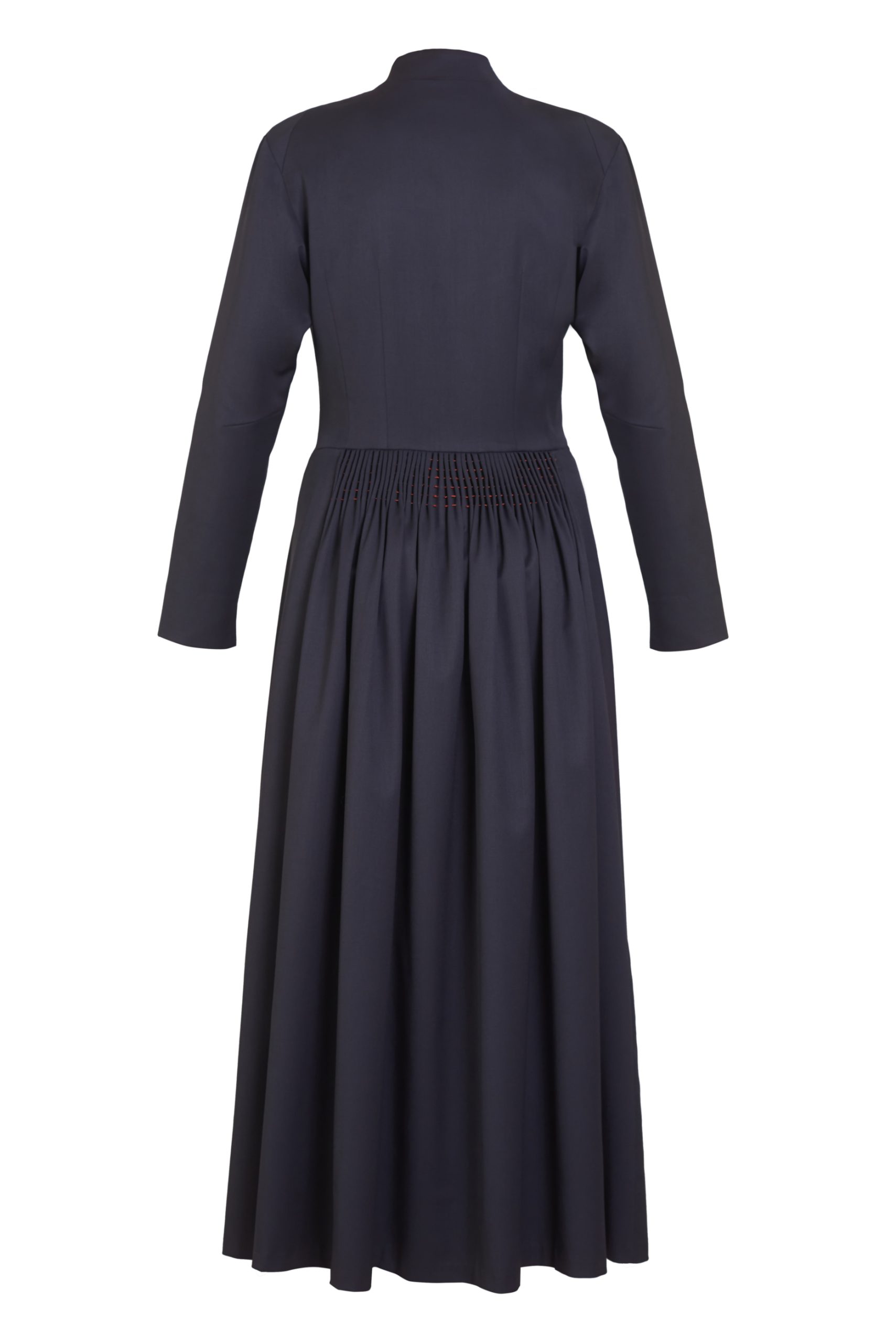 Define your autumn and winter wardrobe with this sophisticated long dress, crafted from 100% Super 120s wool in premium gray for exceptional warmth and drape. A vibrant red interlining adds a secret pop of color while ensuring a comfortable, structured fit. Unique hand-stitched pleating, inspired by traditional Georgian “koklos,” transforms the silhouette with dynamic texture at the back. Bold red thread highlights these intricate folds, creating a striking contrast that enhances the garment’s movement. Master artisans have blended heritage craftsmanship with modern design to create a piece that celebrates authentic style, perfect for both professional settings and evening gatherings.