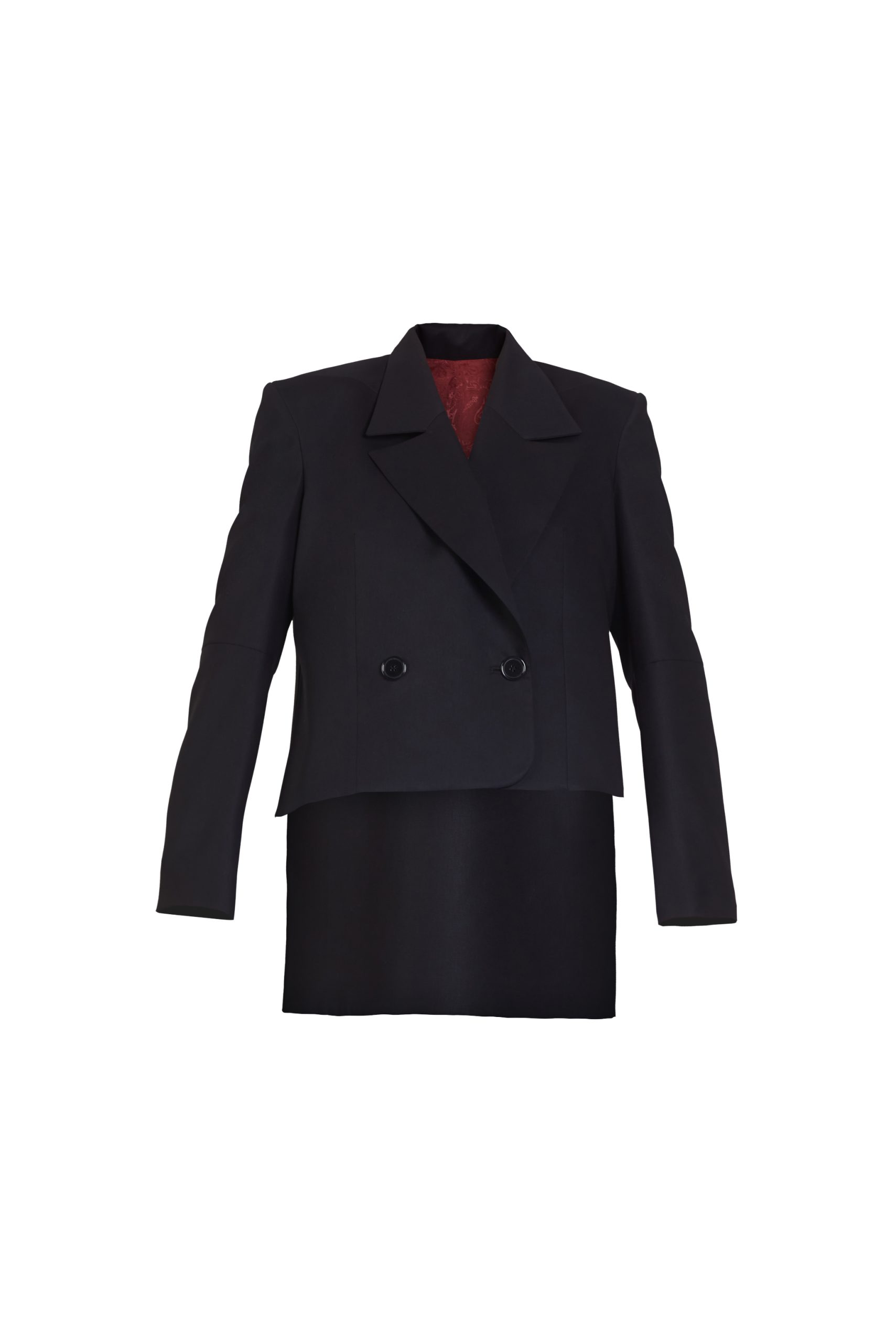 Redefine evening elegance with the Black Frack Jacket, a masterful fusion of white-tie refinement and black-tie sophistication crafted from luxurious super 120s wool. This singular piece marries the heritage of a traditional frack with avant-garde artistry, offering a silhouette that flows with uninhibited movement and a hidden touch of vivid red creative flair.