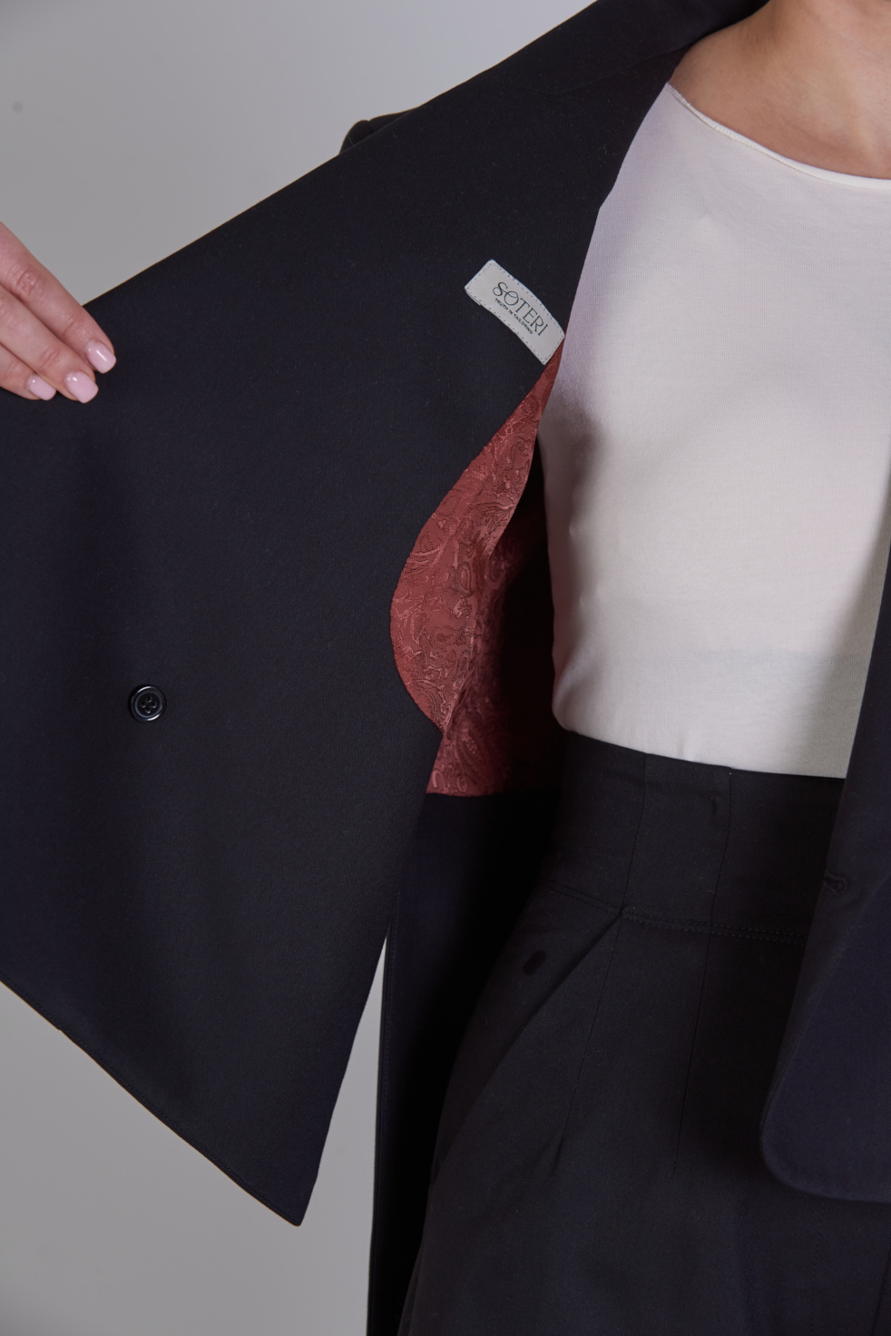 Generous double side slits ensure elegance and ease of movement, while a vivid red viscose interlining adds exceptional comfort and a hidden touch of creative flair.